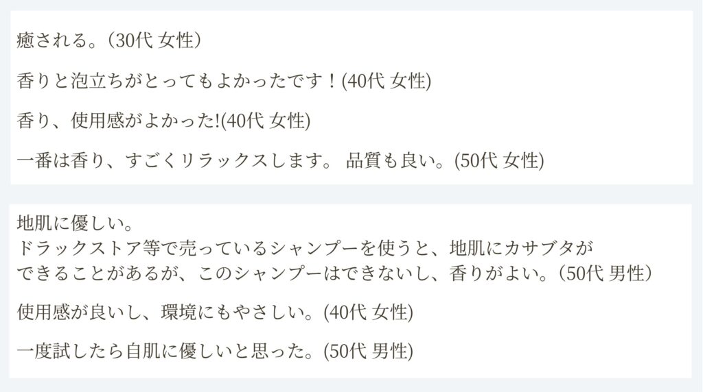<シャンプー>水、ラウロイルメチルアラニンNa、ココイルメチルタウリンNa、コカミドプロピルベタイン、コカミドメチルMEA、加水分解ケラチン(羊毛)、オランダガラシ葉/茎エキス、オドコソウ花/葉/茎エキス、アルニカ花エキス、セイヨウアカマツ球果エキス、セイヨウキズタ葉/茎エキス、ニンニク根エキス、ローマカミツレ花エキス、ゴボウ根エキス、ローズマリー葉エキス、セラミドNP、セラミドAP、セラミドEOP、ラベンダー油、ローズマリー葉油、アトラスシーダー樹皮油、スギ枝/葉油、クオタニウム-33、DPG、コレステロール、フィトスフィンゴシン、ラノリン脂肪酸、トコフェロール、トリイソステアリン酸PEG-160ソルビタン、クエン酸、クエン酸Na、塩化Na、グリセリン、BG、ペンチレングリコール、PCA-Na、1,2-ヘキサンジオール、ポリクオタニウム-10、ジヒドロキシプロピルアルギニンHCl、エチルヘキシルグリセリン、キサンタンガム、カルボマー、ラウロイルラクチレートNa、フェノキシエタノール