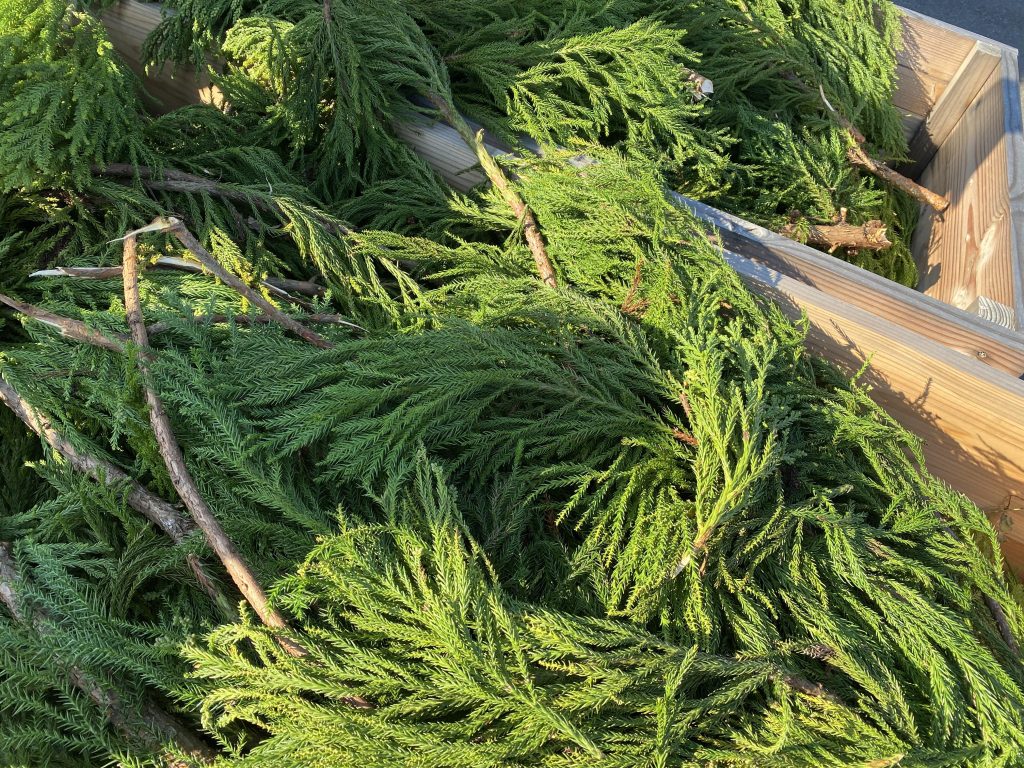 森林保全のための間伐で出た杉の枝葉を活用