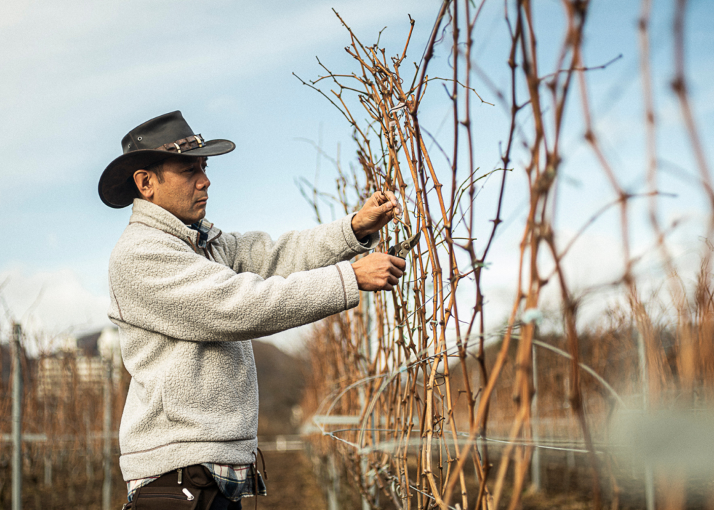 この地で大切に育てられた葡萄の収穫後、最初に行われるツルの剪定は、花芽に樹液が十分に行き届くようにするための大切な作業。