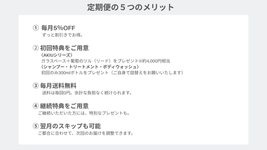 オトクに定期便!お気に入りを自動でお届け。 Pickup 2026.01.22 定期便 日々お気に入りの香りに包まれて暮らしたい。 自分にあったヘアケアを毎日続けたい。 そんな声にお応えし、続けやすいように生まれたオトクに「定期便」は、長く安心して、ご愛用いただけるサービスです。 その都度ご注文いただかなくても、毎月、定期的に商品をお届けいたします。 ・リードディフューザーAKIUシリーズ(60ml、200ml) ・シャンプー・トリートメント・ボディウォッシュ « 前へ ジャーナル一覧 次へ »